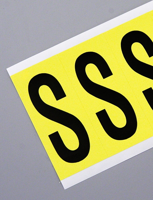 Self-adhesive letters on sheets. Size 38x88 mm. Letter S, black letter on yellow bottom, 6 pieces/sheet. Material MT80 environmentally friendly PVC free fabric. 10 sheets/packages