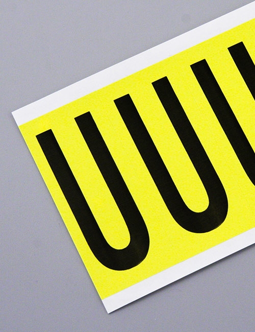 Self-adhesive letters on sheets. Size 38x88 mm. Letter U, black letter on yellow bottom, 6 pcs/sheet. Material MT80 environmentally friendly PVC free fabric. 10 sheets/packages