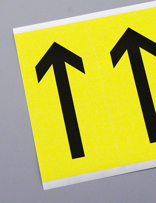 Self-adhesive signs on sheets. Size 74x152 mm. Sign arrow, black sign on yellow bottom, 3 pcs/sheet. Material MT80 environmentally friendly PVC free fabric. 10 sheets/packages