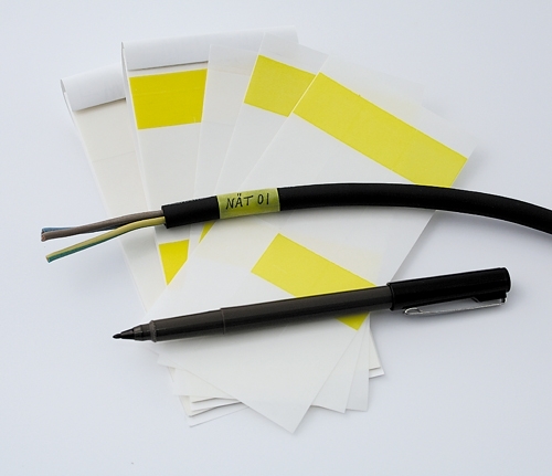 Självhäftande och självlaminerande märkremsor i storlek 25x75 mm. Gul skriv yta i storlek 25x25 mm. 6 märkremsor per ark. 10 ark per häfte. 1 häfte/förp.