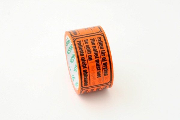 Orange fluorescerande PVC tejp med texten PALLEN FÅR EJ BRYTAS 12 rl/fp